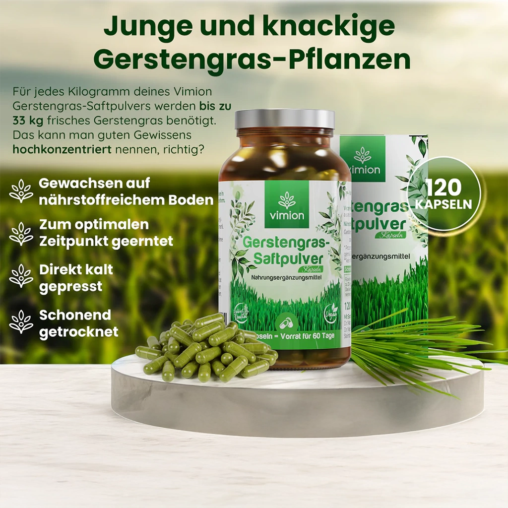 - Gegenüber dem „normalen“ Gerstengras-Pulver hat dein Vimion Gerstengras-Saftpulvers somit den Vorteil: Das Gerstengras-Saftpulver ist viel höher konzentriert. Bei unserer Qualität werden nämlich bis zu 33 kg Gerstengras entsaftet, um am Ende 1 kg Gerstengras-Saftpulver zu enthalten. Das kann man guten Gewissens als hoch-konzentriert bezeichnen, richtig?