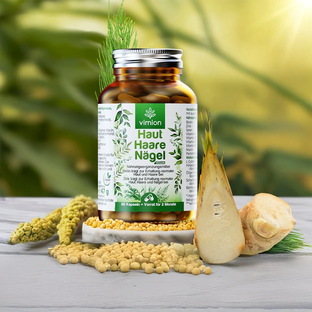 Die Kombination aus hochwertigen Pflanzenextrakten und Mikronährstoffen macht Vimion Haut Haare Nägel Kapseln zu einem erstklassigen Beauty-Nahrungsergänzungsmittel für deine tägliche Routine.